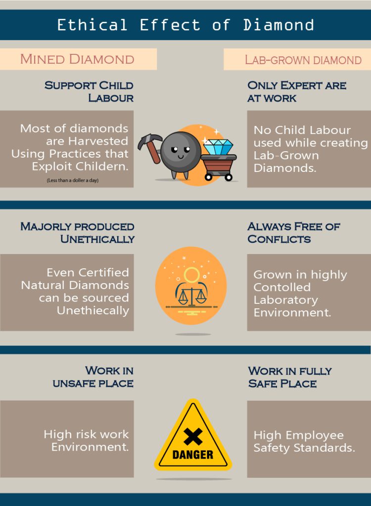 Naturally mined diamonds require diamond mines that, in turn, needs a labor force to back up for the mining. Labors in mining grounds risk their life and health to extract these mined stones for the customers. The payment that these labourers receive is not at all enough to support more than one person. Moreover, many times the villagers living near mining grounds are forced to evacuate their homes so that the distributors can extend their mining grounds.