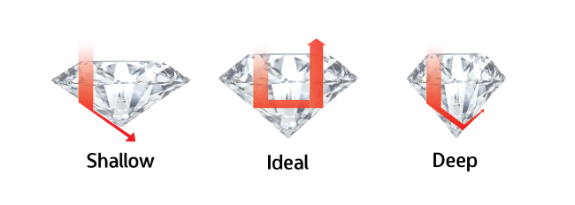 A deeply cut diamond has a greater proportion of its total weight “hidden” in the depth, resulting in a smaller diameter than a well-cut diamond. These differences are usually small but noticeable. A well-cut diamond may even have a slightly lower carat weight than a deeply cut diamond, yet still have a larger diameter, making it appear larger in size.